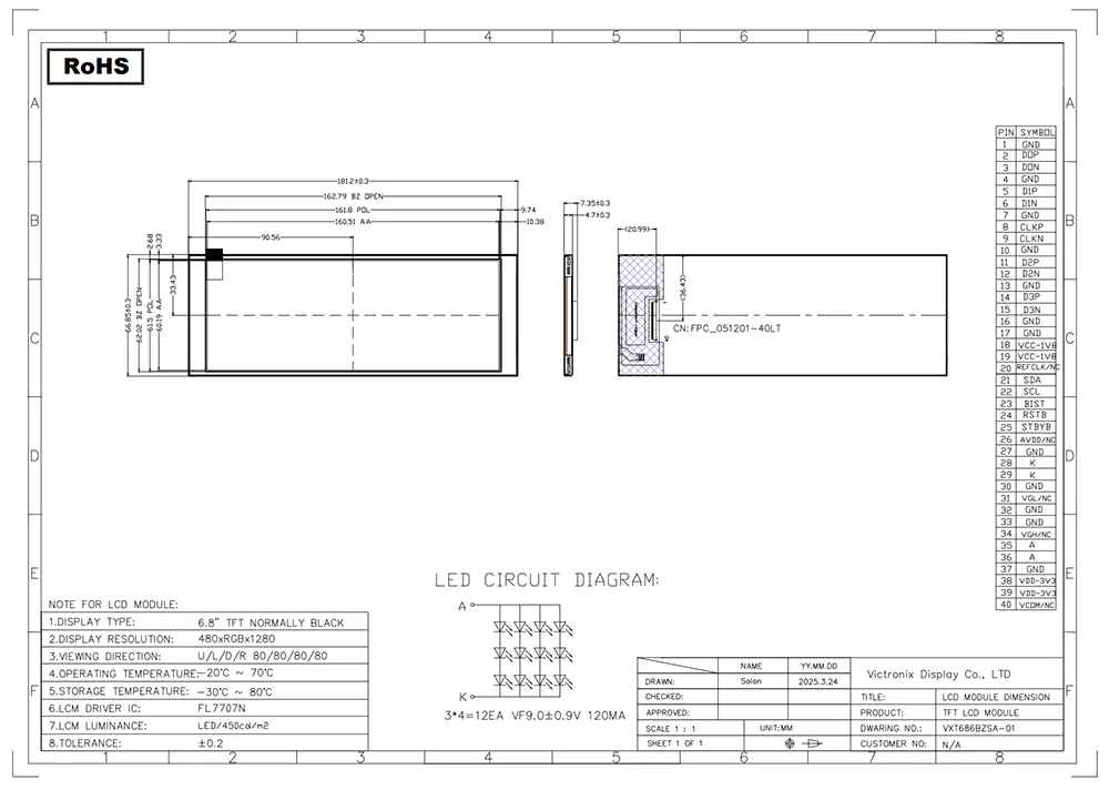 TFT LCD este un tip de afișaj de cristal lichid care utilizează tehnologia tranzistorului cu film subțire pentru a îmbunătăți calitatea imaginii și are numeroase aplicații în viața de zi cu zi. În calitate de producător și furnizor profesionist de modul TFT în China, ce face Victronix 6.86 inch 480 × 1280 IPS Modul TFT diferit de alți producători? La început, oferă o luminozitate tipică de 450cd/m², 16,7 m, un unghi larg de vizualizare de 80 ° (tipic) în toate direcțiile și un raport de contrast de 800: 1, asigurând o lizibilitate excelentă din diferite unghiuri. În al doilea rând, integrează o unitate de iluminare de fundal care utilizează 3 × 4 LED -uri albe cu o viață tipică de 30.000 până la 50.000 ore (până la 50% luminozitate inițială), asigurând o vizibilitate clară în toate condițiile de iluminare. În plus, folosește o interfață MIPI DSI cu 4 benzi pentru transferul de date de mare viteză și integrarea simplificată. În plus, trece teste riguroase de mediu, incluzând depozitarea și funcționarea și funcționarea la temperaturi ridicate, ciclismul de temperatură, testarea căldurii umede (umiditate), astfel încât să poată funcționa perfect pe un interval de temperatură extinsă de la -20 ° C la +70 ° C.