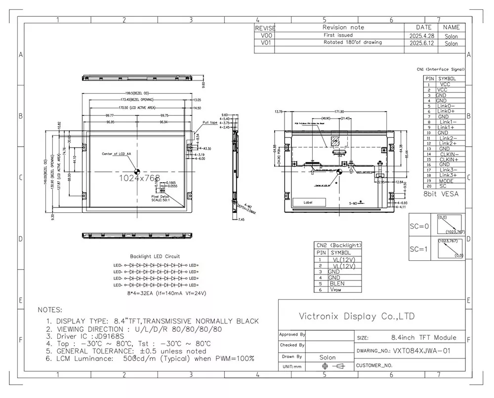 TFT LCD este un tip de afișaj de cristal lichid care utilizează tehnologia tranzistorului cu film subțire pentru a îmbunătăți calitatea imaginii și are numeroase aplicații în viața de zi cu zi. În calitate de producător și furnizor profesionist de modul TFT în China, ce face Victronix 8.4 inch 1024 × 768 IPS TFT LCD diferit de alți producători? În primul rând, oferă o luminozitate tipică de 500 Cd/m², unghiuri de vizualizare de 85 ° lățime ale tuturor direcțiilor și un raport de contrast de 1500: 1, asigurând o lizibilitate excelentă din diverse unghiuri. În al doilea rând, integrează o unitate de iluminare de fundal care utilizează 32 de LED -uri albe cu o durată de viață tipică de 50.000 ore (până la 50% luminozitate inițială), asigurând o vizibilitate clară în toate condițiile de iluminare. În plus, acceptă interfața LVDS cu ESD Protection și JD9168S Controller. În plus, trece teste riguroase de mediu, inclusiv șoc termic (-30 ° C ↔ +80 ° C cicluri), depozitare a umidității (60 ° C/90% RH) și vibrații mecanice, asigurându-se că poate funcționa perfect pe un interval de temperatură extinsă (-30 ° C până la +80 ° C).